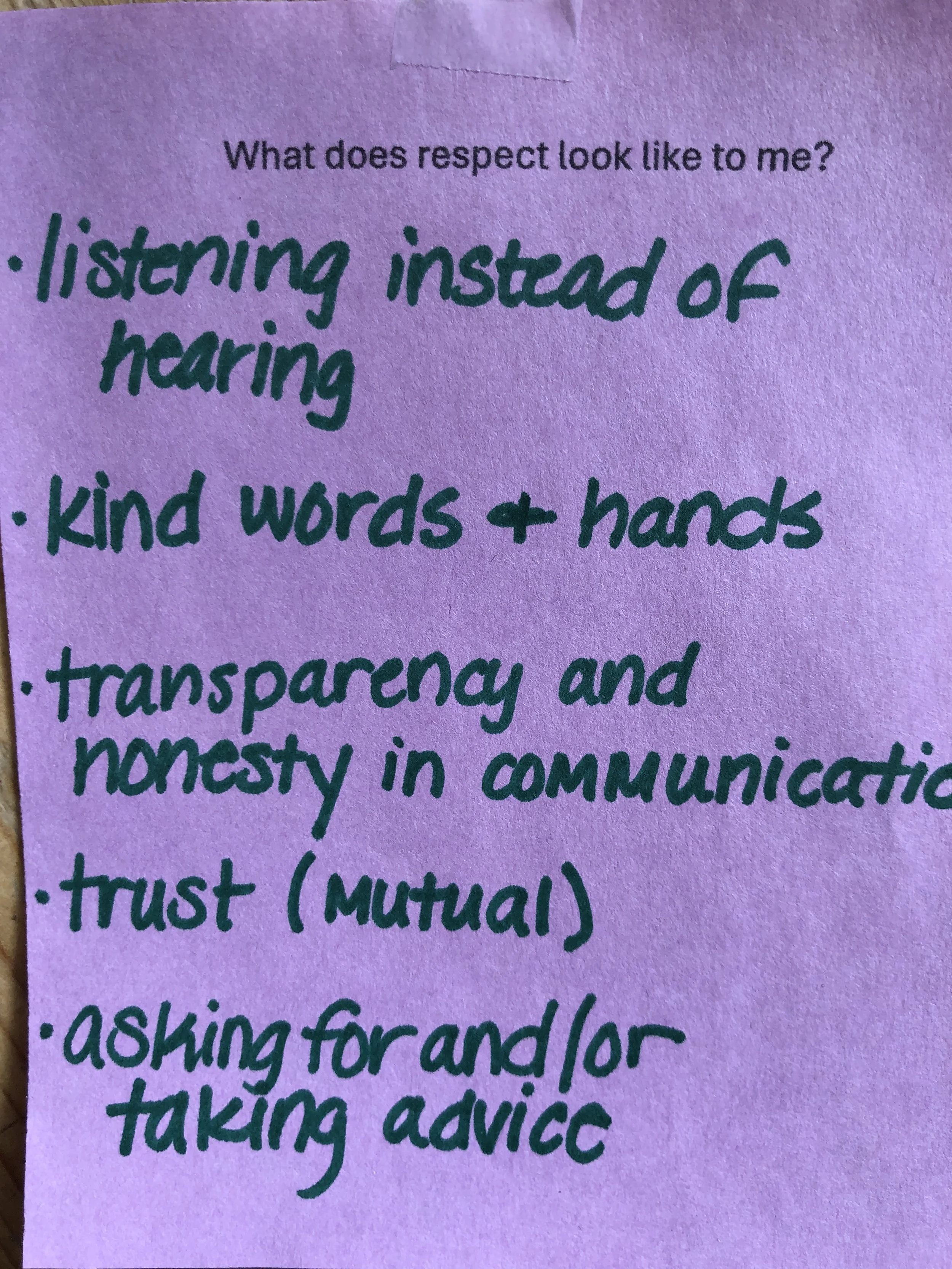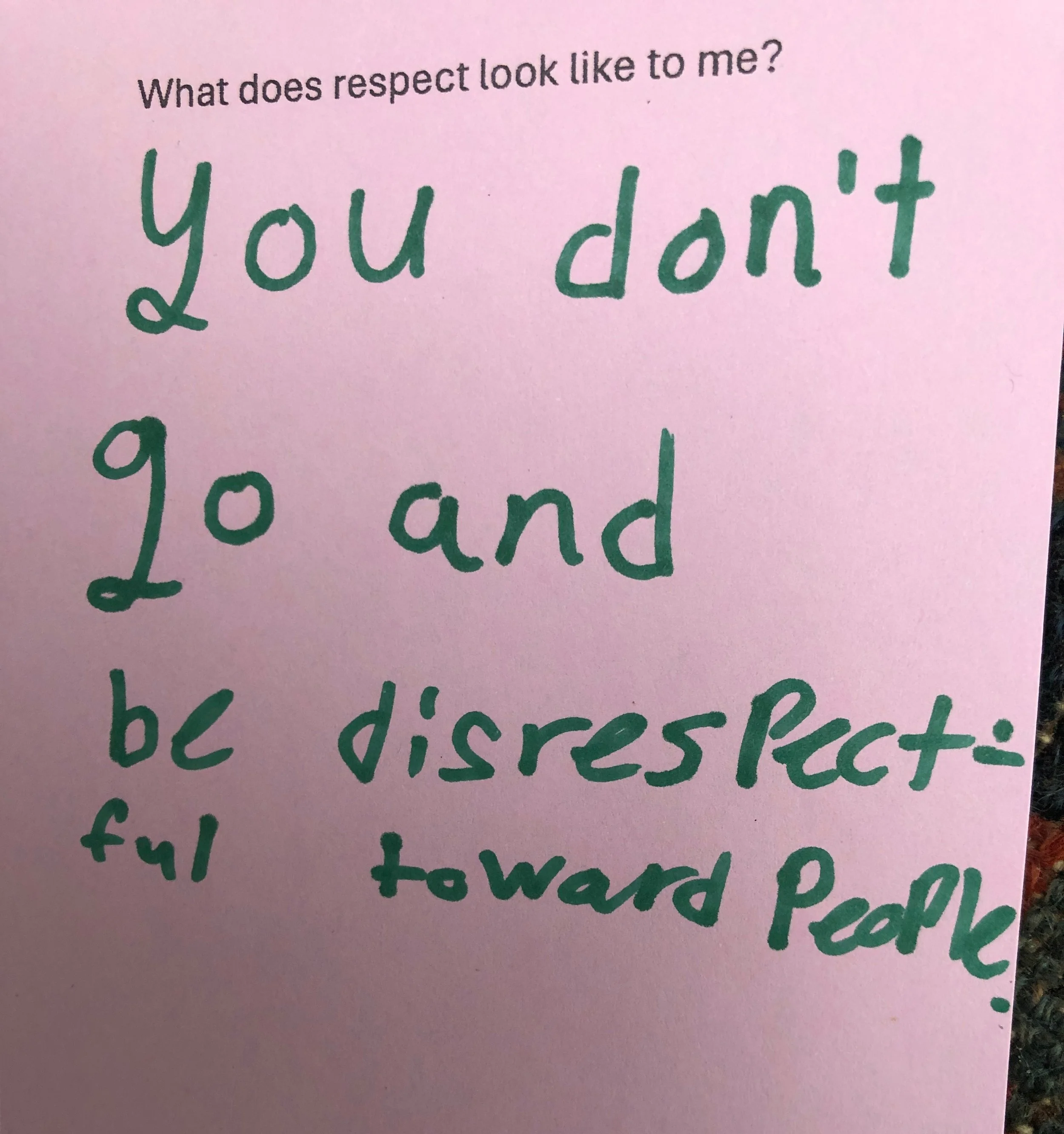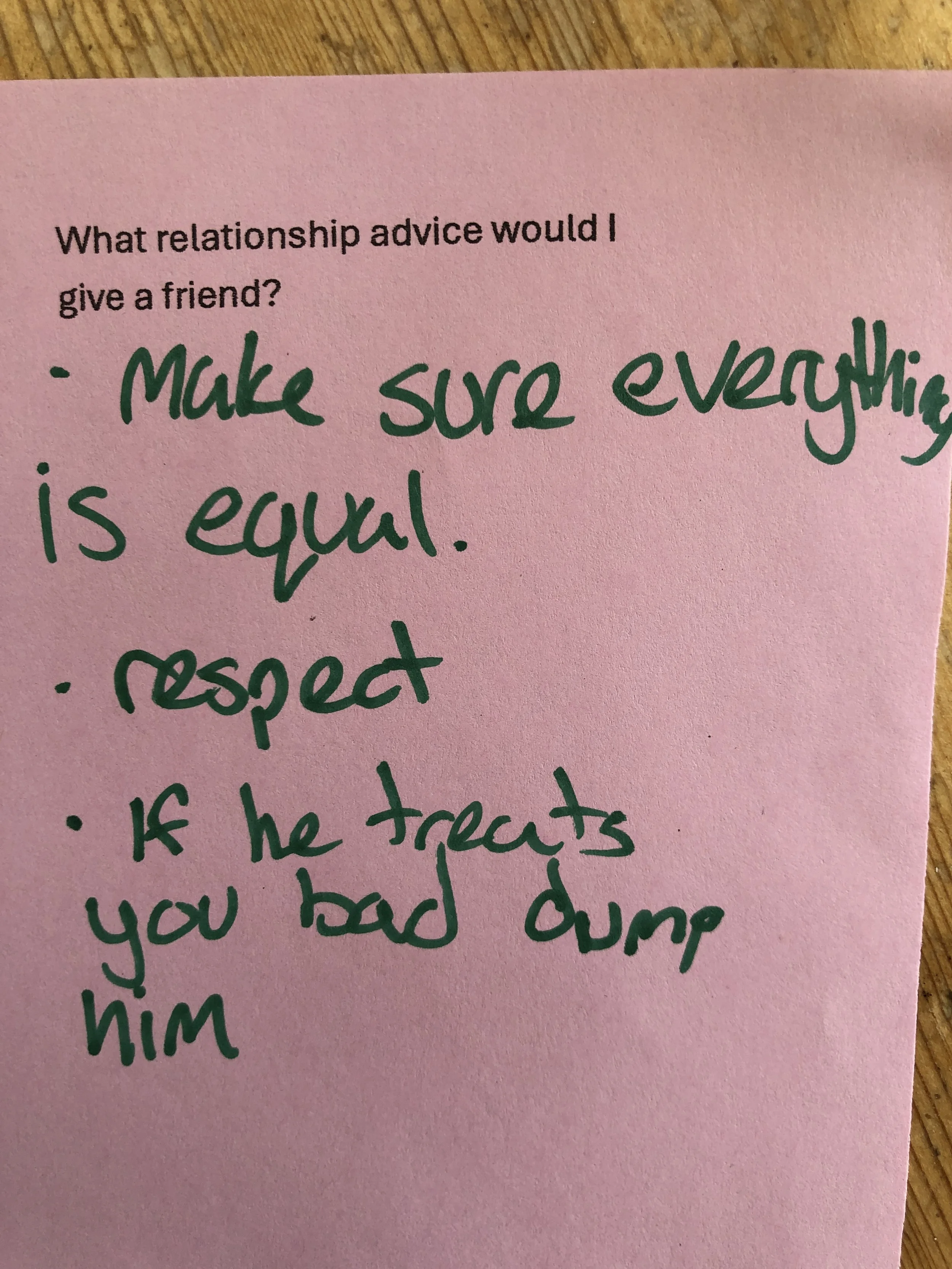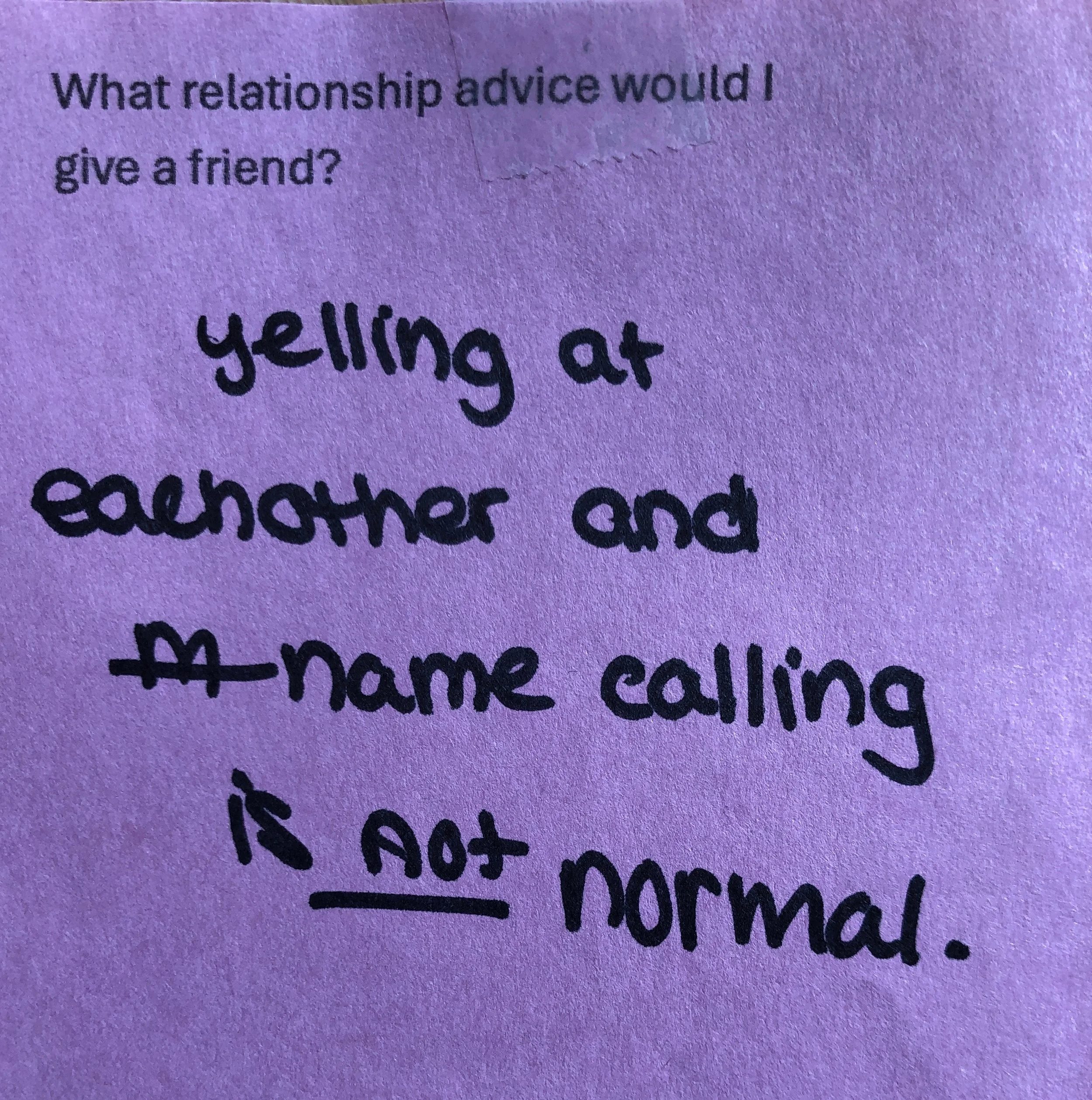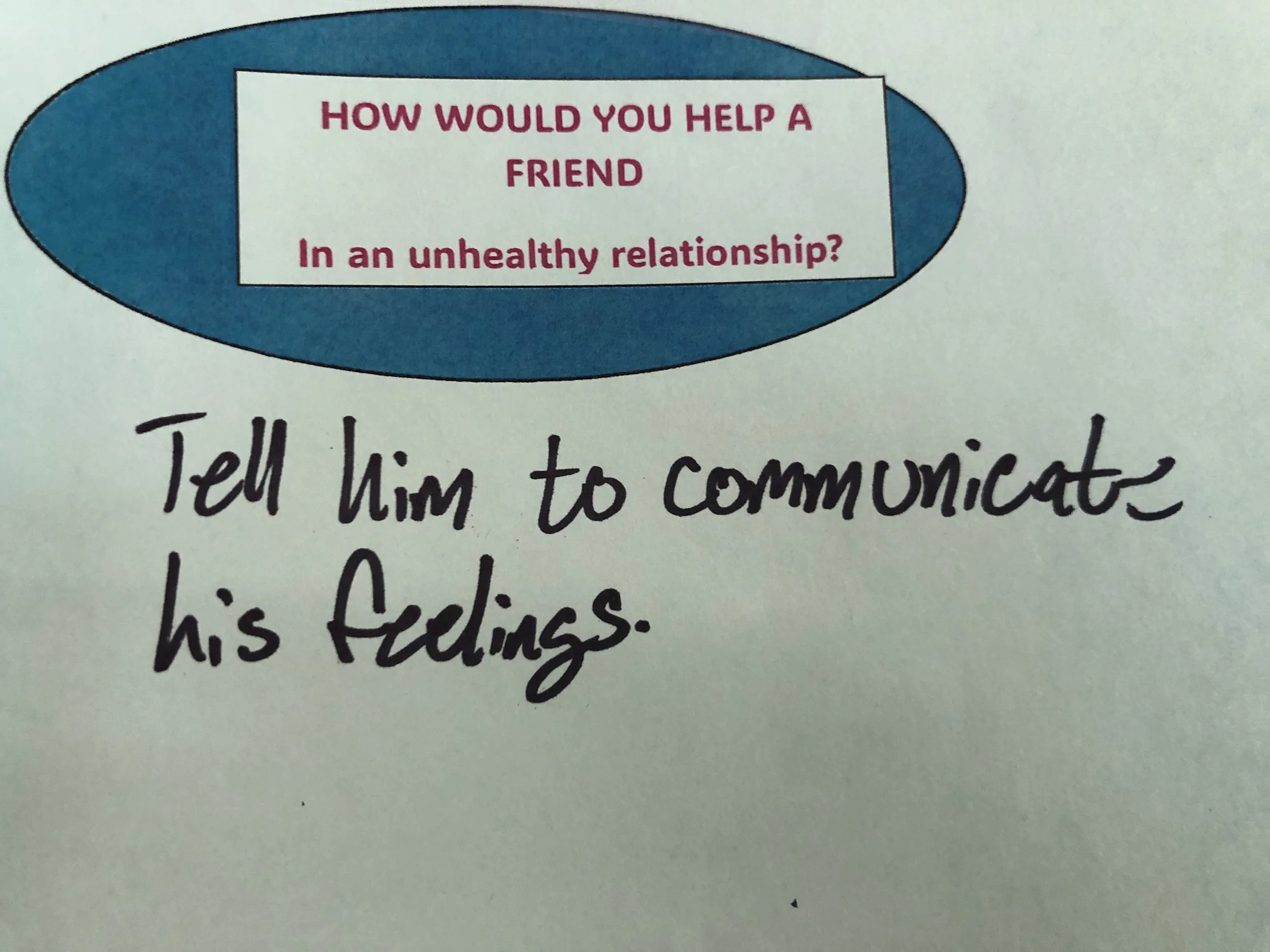 1. Read a writing prompt response and ask students if they agree with it. Why? Does the writing reflect how students treat each other in friendships? Dating relationships? What would you do if you saw someone being treated poorly? Are there things we can do or say? Let’s make a list of our ideas. Which is your favorite? Let’s practice what we might say or do using our list of ideas.