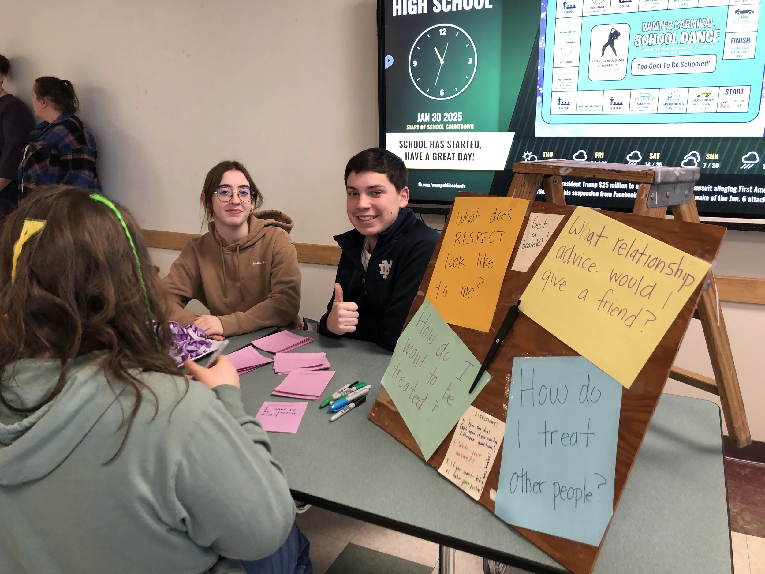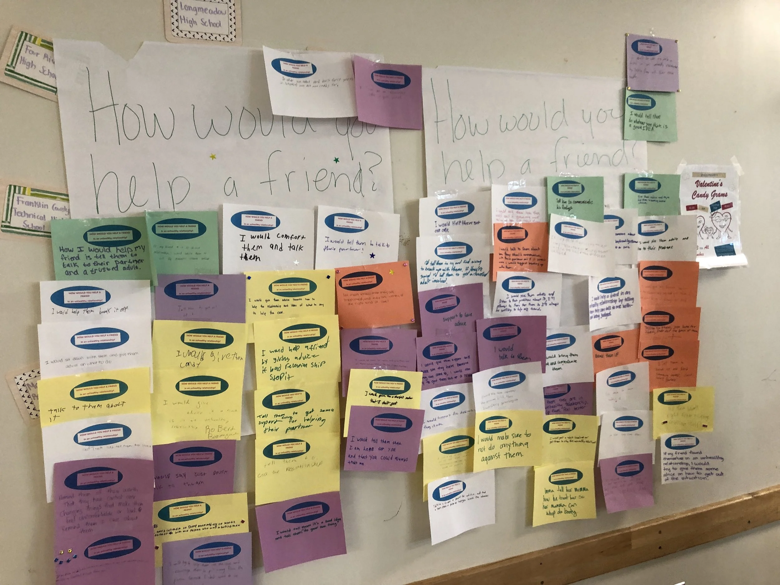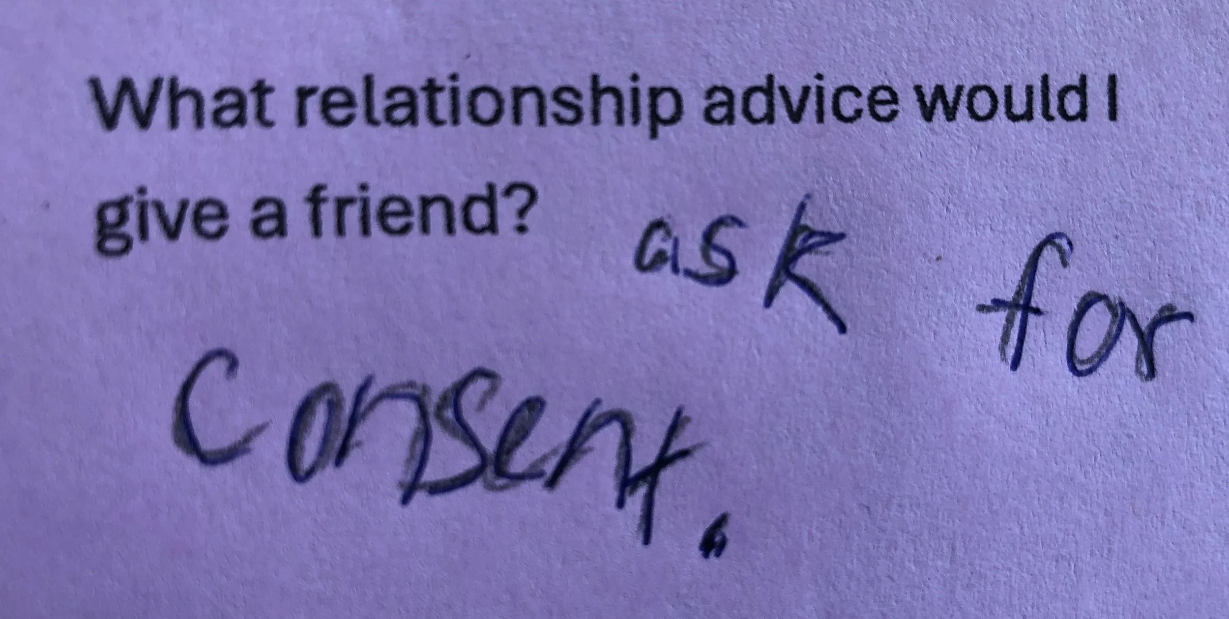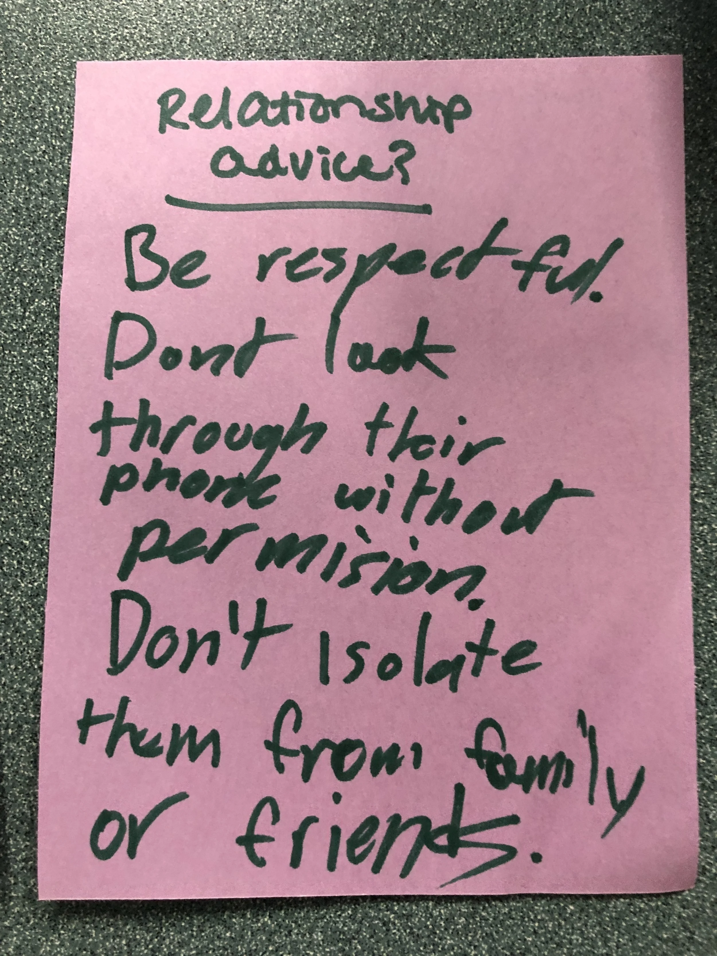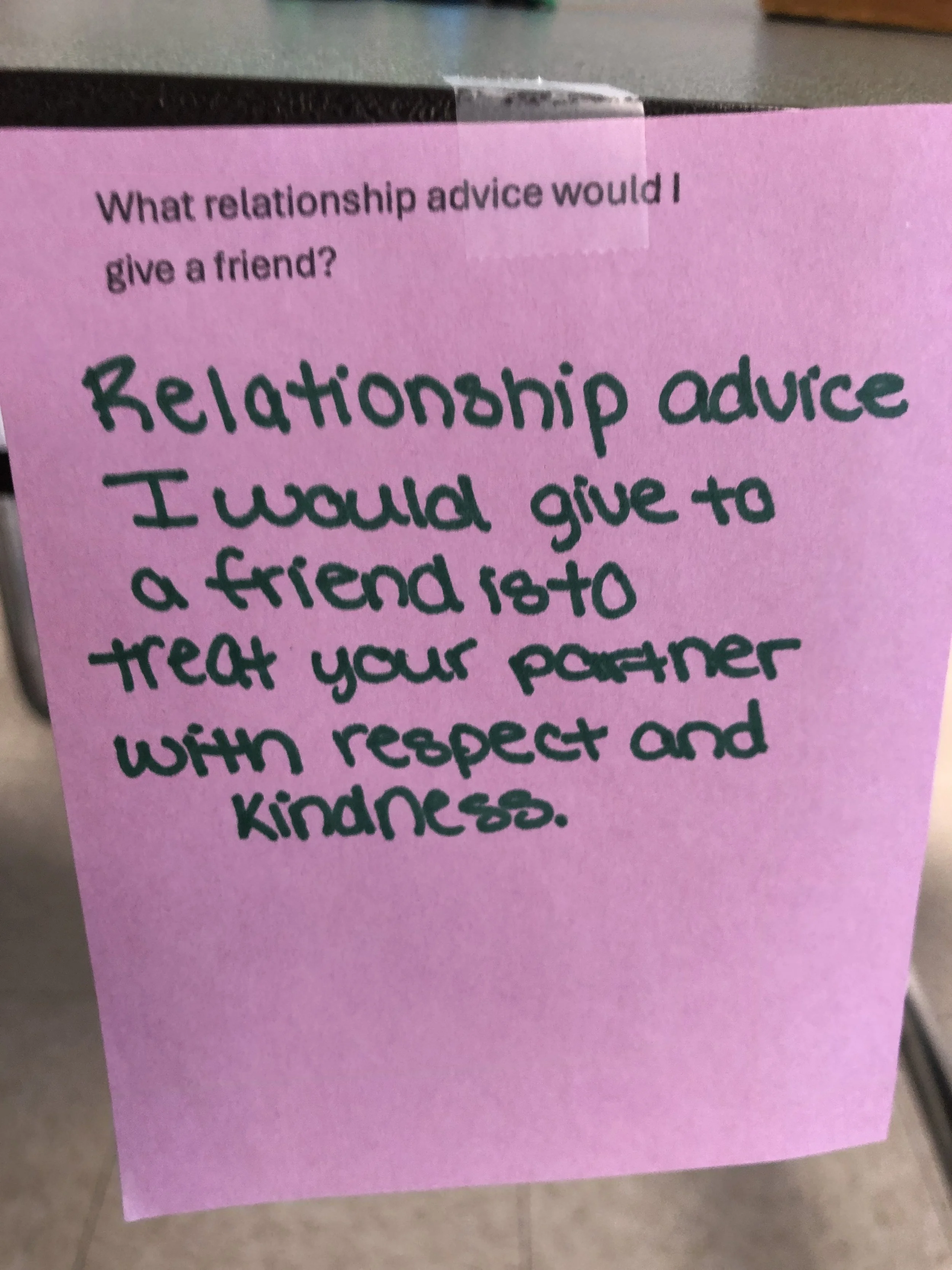 Background: The writing prompt project is a simple way to promote healthy relationships in schools that involves students, takes minimal classroom time, gives teachers options for how involved to be, and extends over time so it can be more impactful than a one time activity. The project goal is to give voice to healthy student beliefs that might not otherwise get expressed. We hope this will help cultivate and normalize healthy attitudes and beliefs among students.